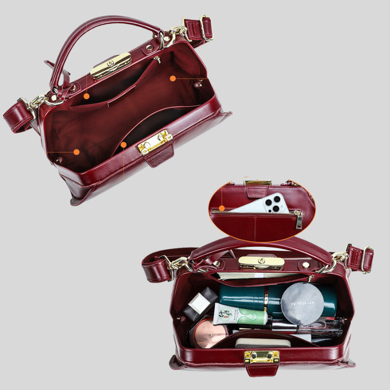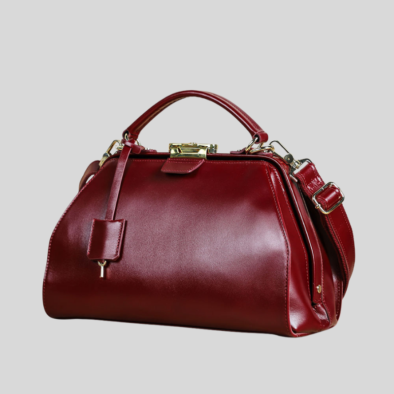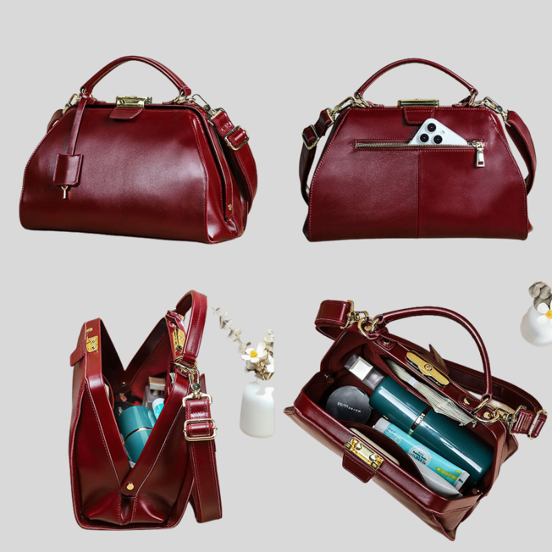 Crafted from genuine full-grain leather, this bag is a quiet statement of strength and sophistication — designed to age beautifully as it journeys with you. Its structured silhouette opens with a refined hinged frame and secure lock, offering both elegance and confidence in every detail.